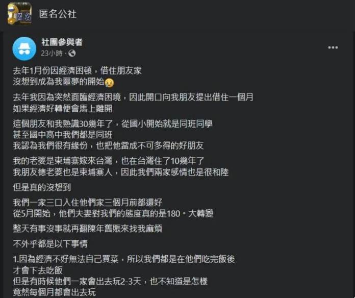 一名網友在「匿名公社」發文,表示自己和這位朋友認識將近30年,從國小就同班相識成為摯友,後來長大後都成家立業,連妻子都是柬埔寨人,兩家關係非常好,去年因為自己經濟狀況出現問題,帶著妻小向他求助借住一個月,還保證:「如果經濟好轉就會馬上離開」