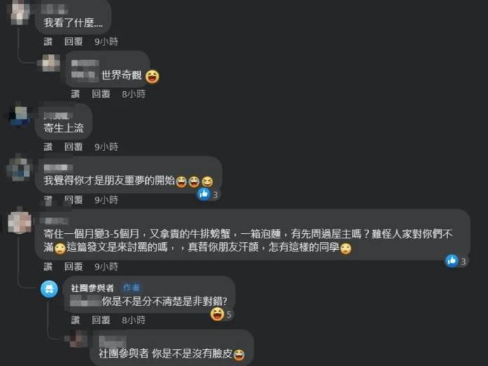 這則貼文曝光後,底下不少人譴責原PO:「反串文嗎?每日一詞:理所當然,我是你朋友就叫你滾了」、「寄人籬下還不懂感恩!真的把人家家裡當自己家喔」、「讓你住…真的是你朋友惡夢的開始」、同理心啥小,人家同情你,不是要你當寄生蟲」