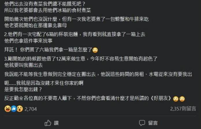 文中更抱怨對方,「有一次我老婆煮了一包螃蟹和牛排來吃,他老婆就開始在那邊靠北靠母」還有一次,友人家中宅配了6箱杯裝泡麵,他看到後就拿走了一箱,被對方責備後,更直言:「拜託! 你們買了六箱我們拿一箱是怎麼了」