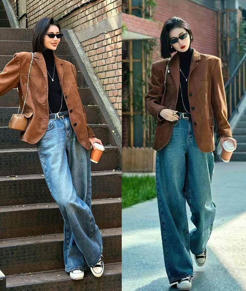 藍色牛仔褲一直是清爽感的代名詞,但因為面料比較粗糙立體的特點,與圖中這件棕色外套也能形成幾分呼應感,看起來又清新又帥氣。