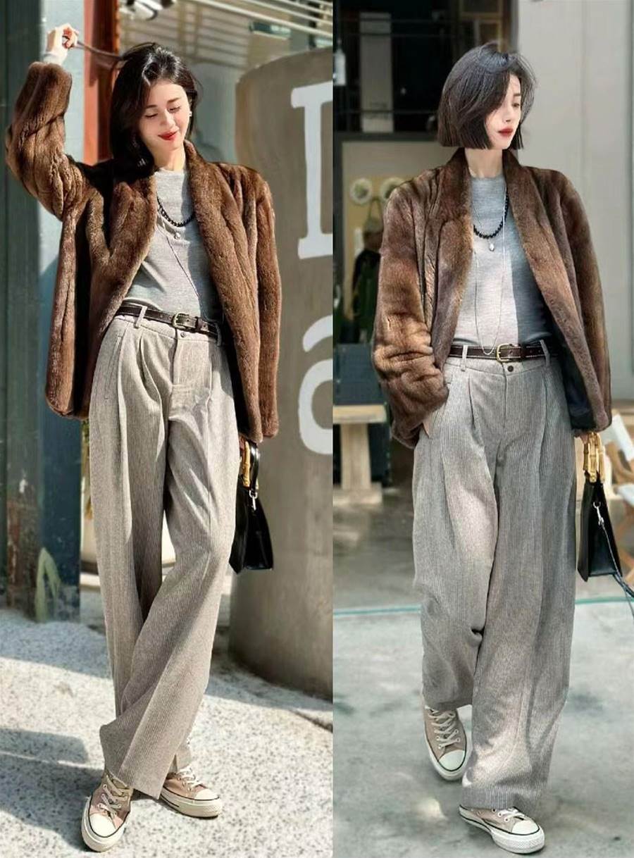 圖中這位博主的穿搭就十分保暖時髦,上身運用的是棕色羊羔絨外套,配合寬松版型,十分凸顯大氣風范,與寬大的西褲疊加,也穩妥的保持了這種時尚風格。