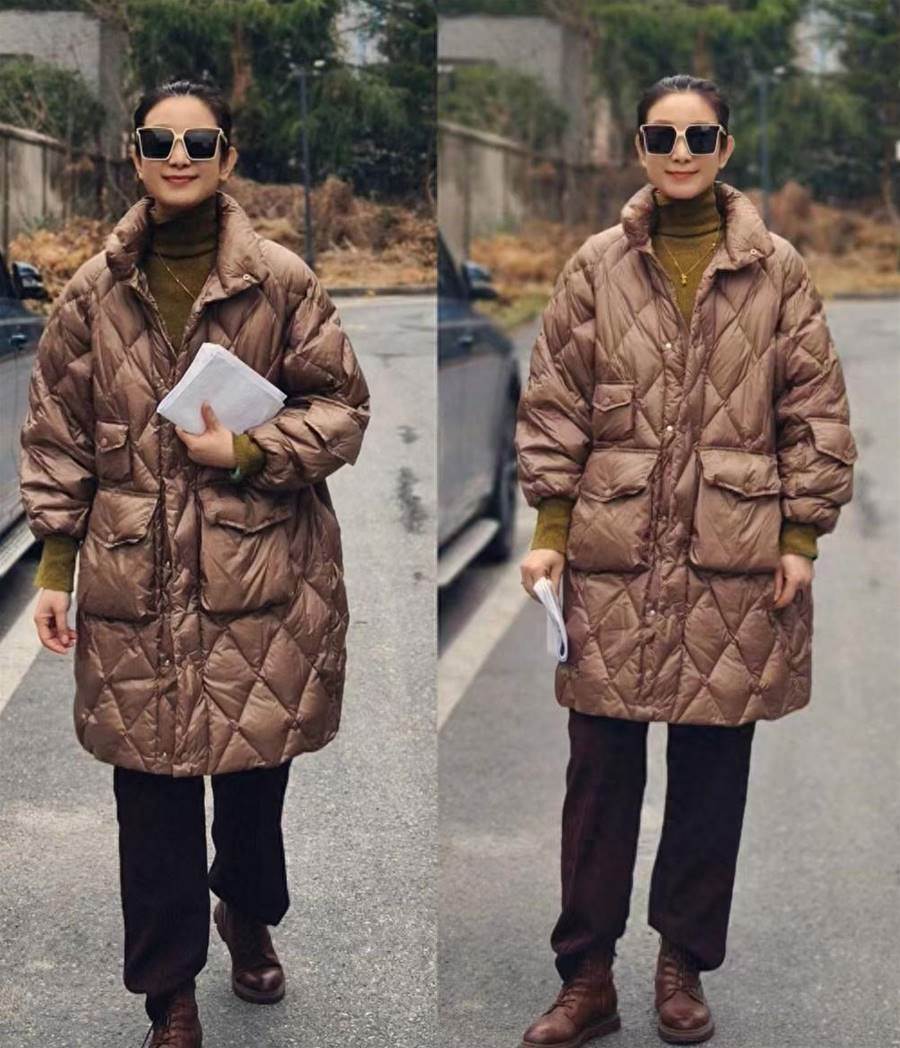 像這件中長款羽絨服,棕色加持了整體的穩重感,看起來比較符合中年時代特有的氣質,因為面料的緣故,外觀往往很難避免臃腫的蓬松感,因此選擇修身長褲搭配,也是為了平衡出耐看的協調效果。